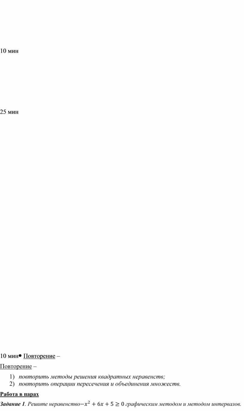 Повторение – 1) повторить методы решения квадратных неравенств; 2) повторить операции пересечения и объединения множеств. Работа в парах Задание 1. Решите неравенство Один ученик из пары решает неравенство одним методом, а второй ученик решает это же неравенство другим методом. Затем они обмениваются тетрадями и выполняют взаимопроверку. Задание 2.Покажите на числовой прямой и найдите объединение и пересечение двух множеств (промежутков)М и K, если: 1)