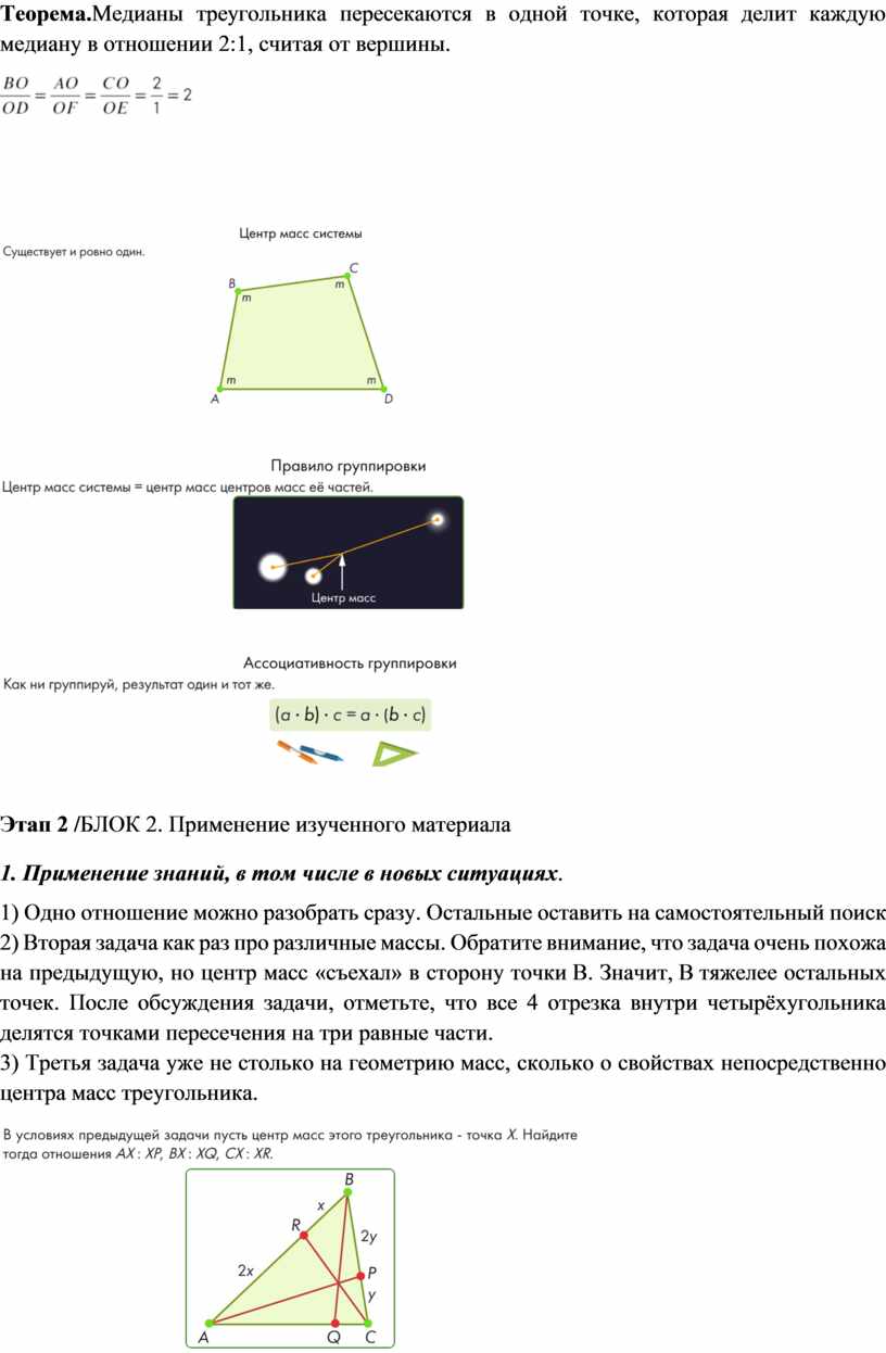 2) Дайте определение центроида - точка пересечения медиан, он же центр масс треугольника. Еще раз обратите внимание, что центром масс он будет только при равных массах в вершинах.