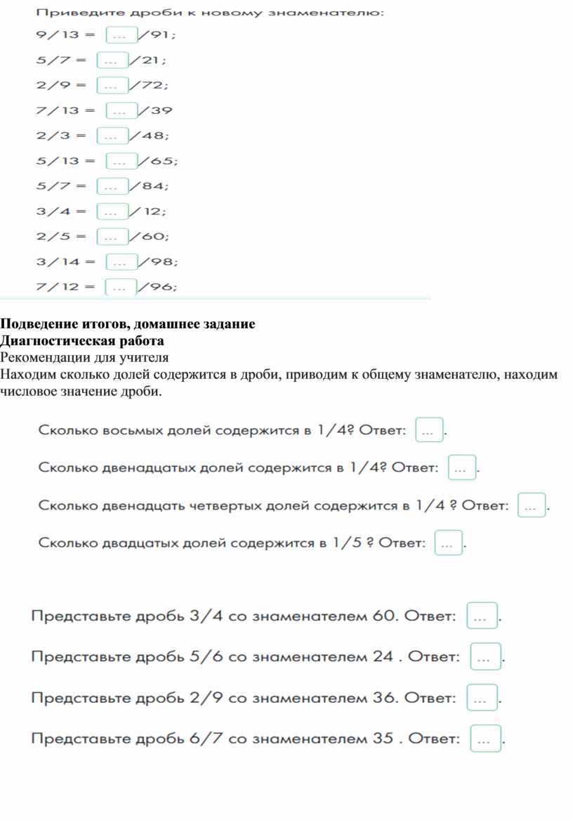 Краткая информация по урокуУрок по предмету «Математика» для 5 класса по теме «Приведение дроби к новому знаменателю. 1». Комбинированный урок. На уроке предусмотрено использование следующих типов электронных образовательных материалов: «Диагностическая работа».