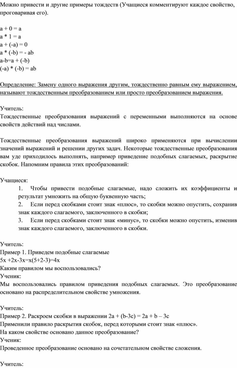 Можно привести и другие примеры тождеств (Учащиеся комментируют каждое свойство, проговаривая его).