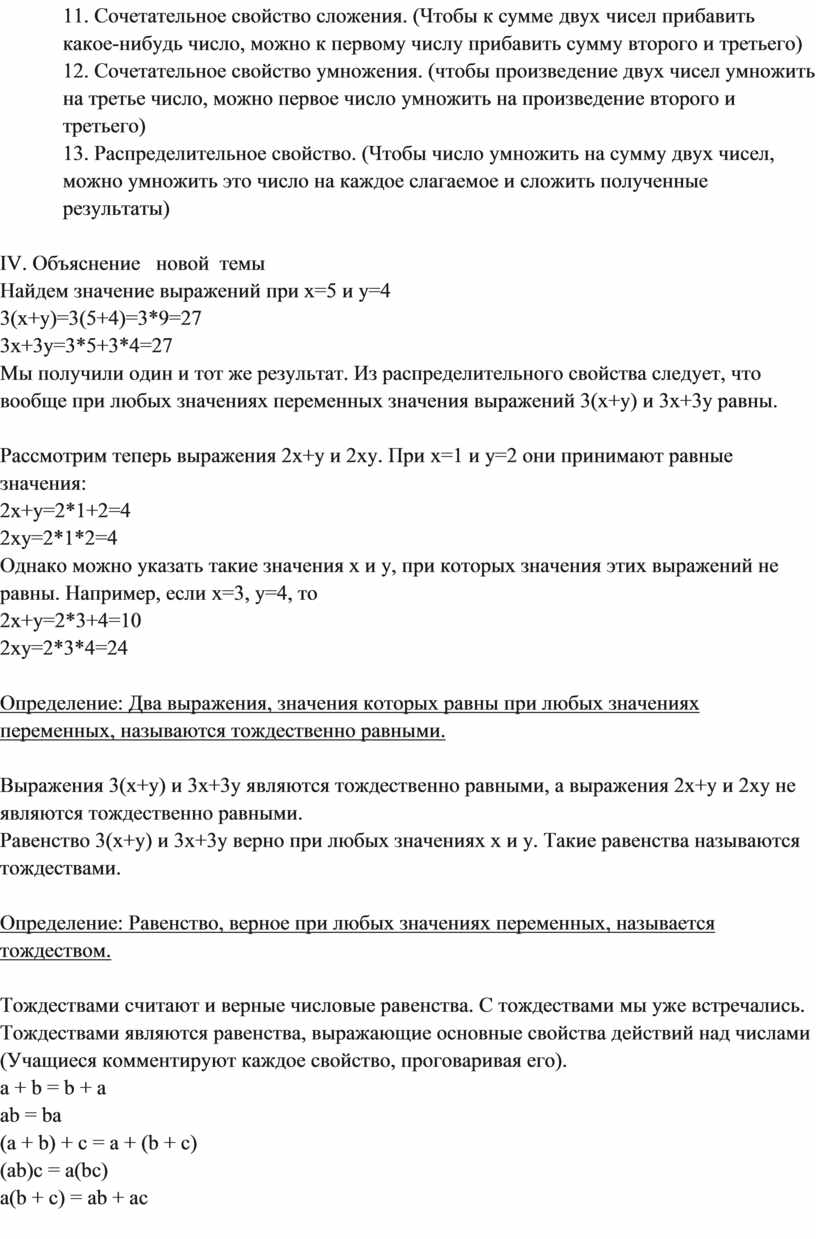 Тождествами считают и верные числовые равенства. С тождествами мы уже встречались. Тождествами являются равенства, выражающие основные свойства действий над числами (Учащиеся комментируют каждое свойство, проговаривая его).