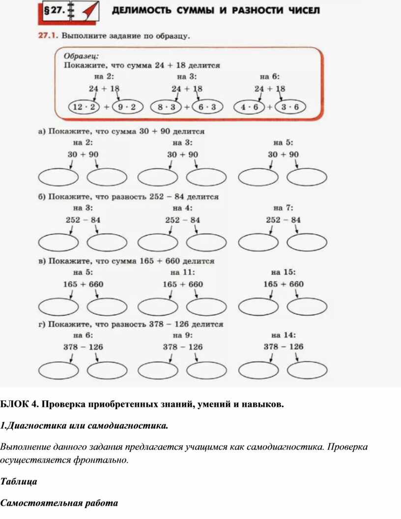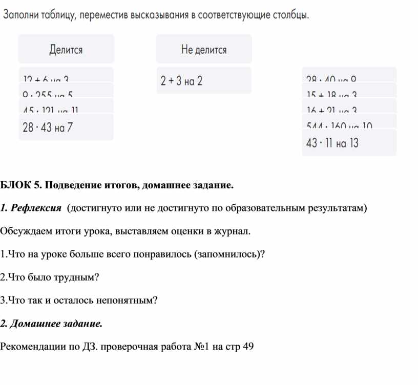 После выполнения данной работы идёт фронтальная проверка результатов, формулируются выводы о делимости суммы и делимости произведения.