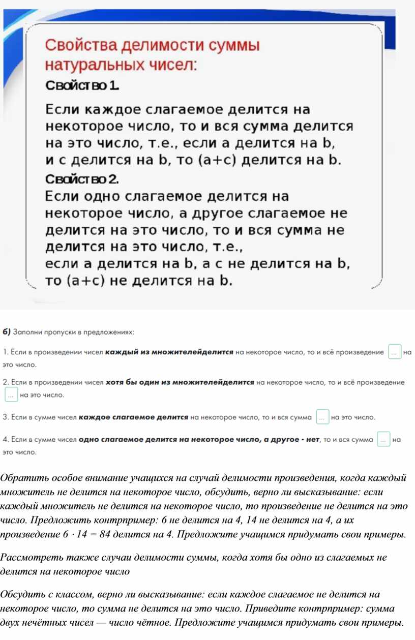 Обратить особое внимание учащихся на случай делимости произведения, когда каждый множитель не делится на некоторое число, обсудить, верно ли высказывание: если каждый множитель не делится на некоторое число, то произведение не делится на это число. Предложить контрпример: 6 не делится на 4, 14 не делится на 4, а их произведение 6 ⋅ 14 = 84 делится на 4. Предложите учащимся придумать свои примеры.