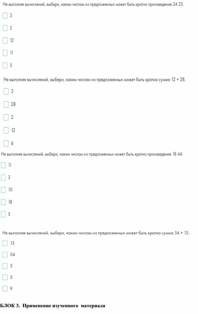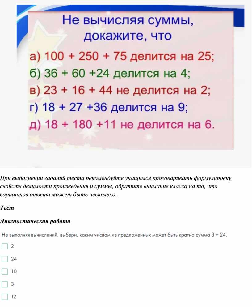 При выполнении заданий теста рекомендуйте учащимся проговаривать формулировку свойств делимости произведения и суммы, обратите внимание класса на то, что вариантов ответа может быть несколько.