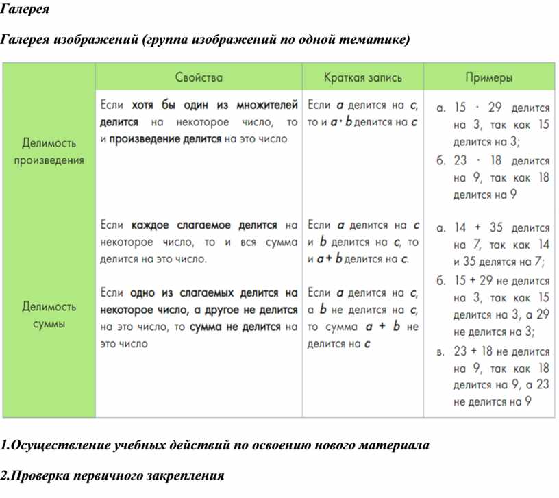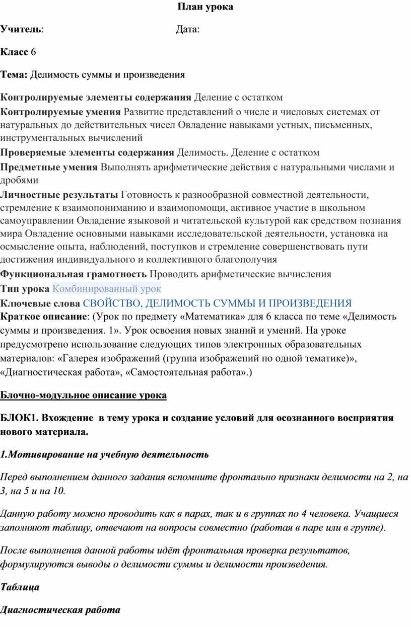 Краткое описание: (Урок по предмету «Математика» для 6 класса по теме «Делимость суммы и произведения. 1». Урок освоения новых знаний и умений. На уроке предусмотрено использование следующих типов электронных образовательных материалов: «Галерея изображений (группа изображений по одной тематике)», «Диагностическая работа», «Самостоятельная работа».)