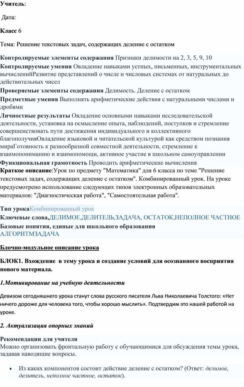 Краткое описание:Урок по предмету "Математика" для 6 класса по теме "Решение текстовых задач, содержащих деление с остатком". Комбинированный урок. На уроке предусмотрено использование следующих типов электронных образовательных материалов: "Диагностическая работа", "Самостоятельная работа".