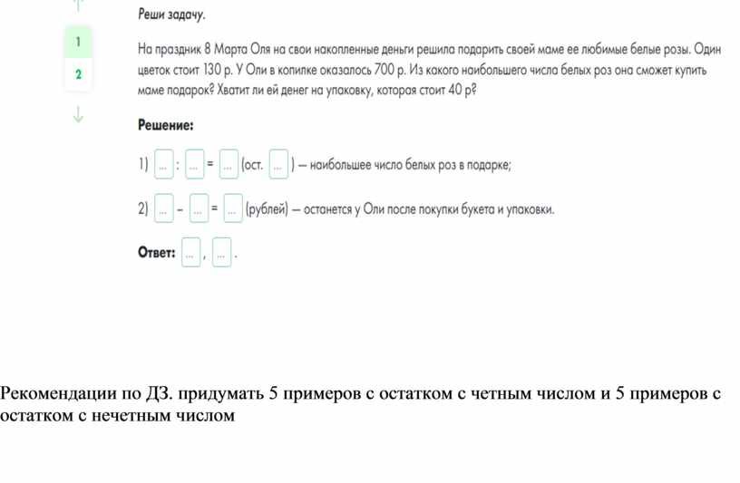 Рекомендации по ДЗ. придумать 5 примеров с остатком с четным числом и 5 примеров с остатком с нечетным числом