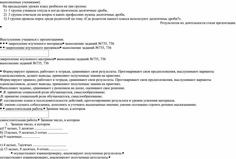 «Какую тему мы начали изучать?» Что мы знаем о десятичных дробях? «Как читаются и записываются десятичные дроби?» (просмотр презентаций, выполненные учениками). На предыдущих уроках класс разбился на три группы: 1) 1 группа узнавала откуда и когда произошли десятичные дроби, 2) 2 группа отвечали на вопрос в каких профессиях нужны десятичные дроби, 3) 3 группа провела опрос среди родителей на тему «Где родители нашего класса используют десятичные дроби?». Результатом их деятельности стали презентации.