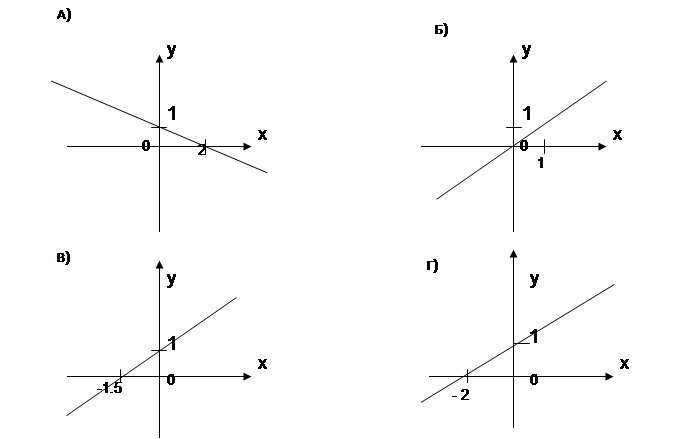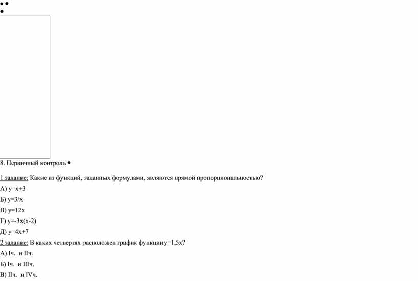 1 задание: Какие из функций, заданных формулами, являются прямой пропорциональностью? А) y=x+3 Б) y=3/x В) y=12x Г) y=-3x(x-2) Д) y=4x+7 2 задание: В каких четвертях расположен график функции y=1,5x? А) Iч. и IIч. Б) Iч. и IIIч. В) IIч. и IVч. Г) IIIч. и IVч. Д) IIч. и IIIч. 3 задание: Прямая пропорциональность задана формулой y=0,5x. Найдите значение функции, если аргумент равен -10? А) -5; Б) 0; В) 20; Г) 5; Д) -20; 4 задание: Укажите прямую, которая является графиком прямой пропорциональности.
