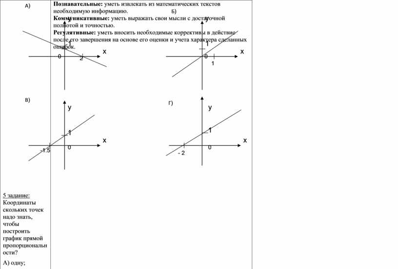 5 задание: Координаты скольких точек надо знать, чтобы построить график прямой пропорциональности? А) одну; Б) три; В) четыре; Г) две; Д) пять; Самопроверка. |