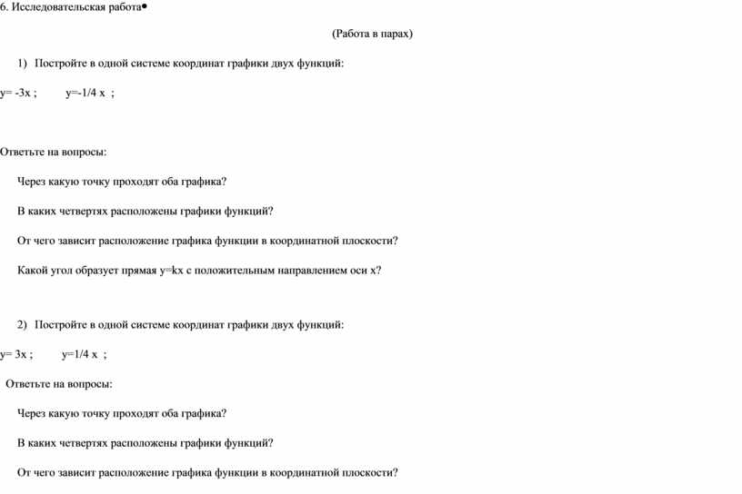 Ответьте на вопросы: Через какую точку проходят оба графика? В каких четвертях расположены графики функций? От чего зависит расположение графика функции в координатной плоскости? Какой угол образует прямая у=kх с положительным направлением оси х?
