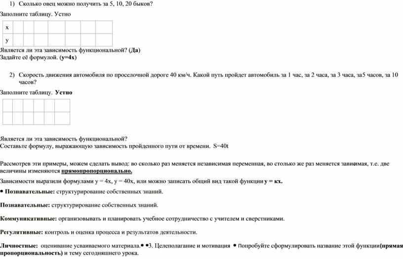 ли эта зависимость функциональной? (Да) 2) Скорость движения автомобиля по проселочной дороге 40 км/ч. Какой путь пройдет автомобиль за 1 час, за 2 часа, за 3 часа, за 5 часов, за 10 часов? Заполните таблицу. Устно