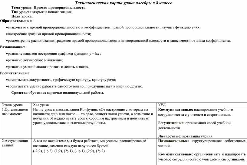 Технологическая карта урока алгебры в 8 классе