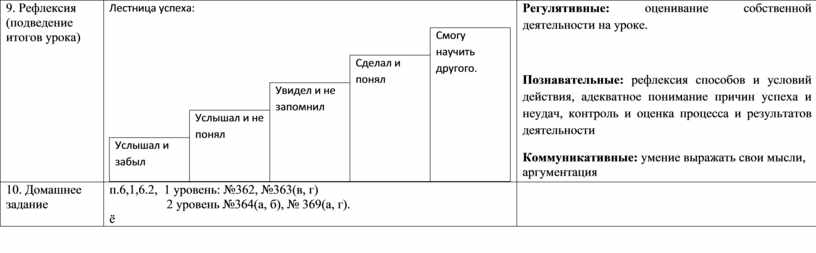 Познавательные: рефлексия способов и условий действия, адекватное понимание причин успеха и неудач, контроль и оценка процесса и результатов деятельности Коммуникативные: умение выражать свои мысли, аргументация |
