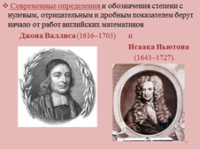 Современные определения и обозначения степени с нулевым, отрицательным и дробным показателем берут начало от работ английских математиков Джона Валлиса(1616–1703) и Исаака Ньютона.