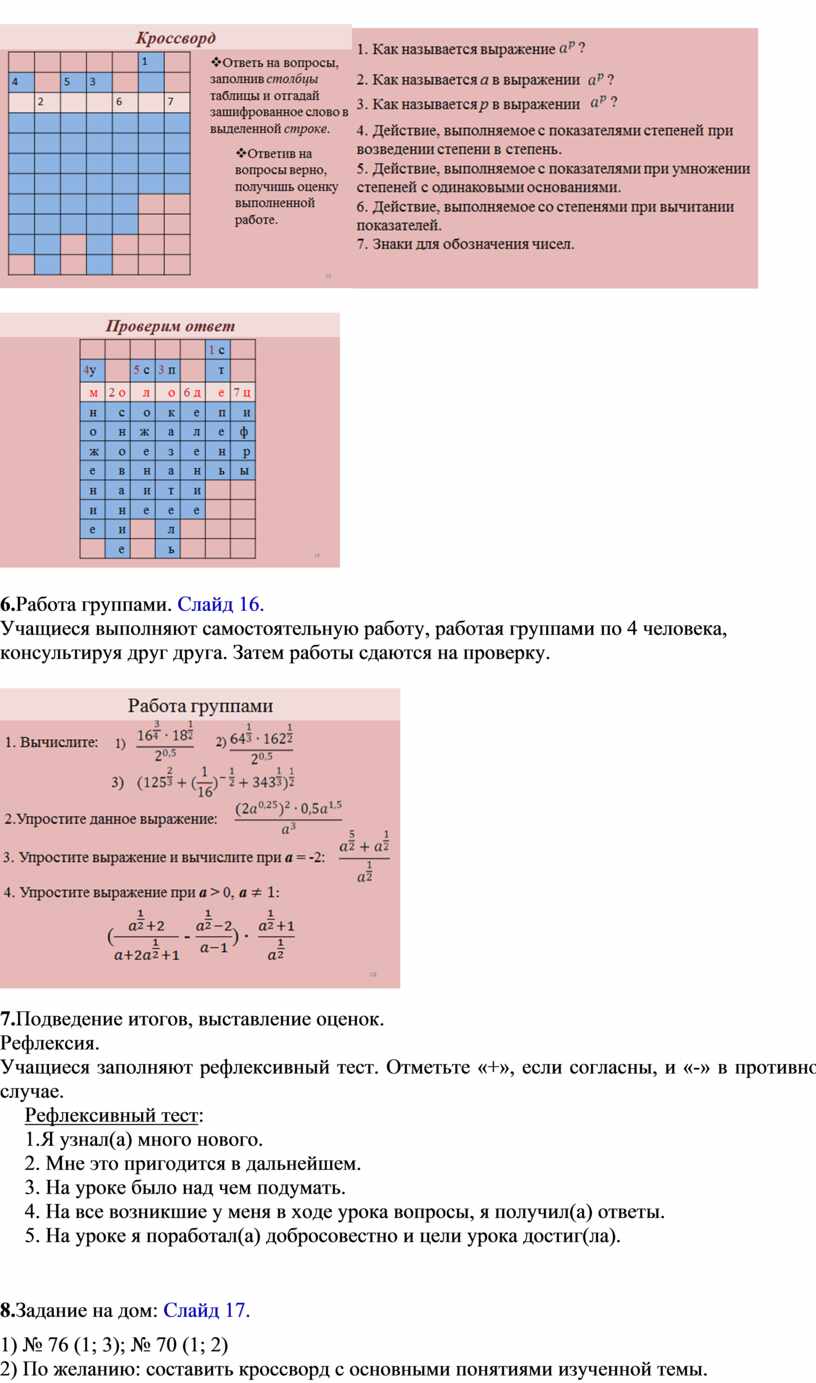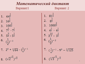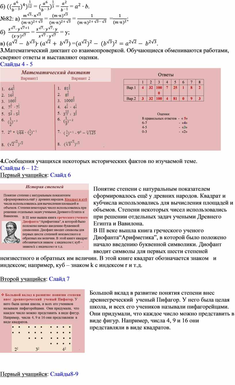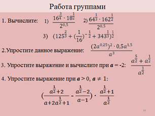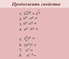 1) Повторение свойств степени с рациональным показателем: обучающиеся должны продолжить написанные свойства – фронтальный опрос. Слайд 3.
