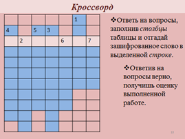 Обучающиеся получают листы с кроссвордом. Решают парами. Оценку получает пара, решившая первой. Слайды 13-15.