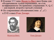 В конце ХVI века Франсуа Виетввел буквы для обозначения не только переменных, но и их коэффициентов. Он применял сокращения: N, Q, C – для первой, второй и третьей степеней.