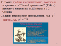 встречаются в “Полной арифметике” (1544 г.) немецкого математика М.Штифеля и у С.