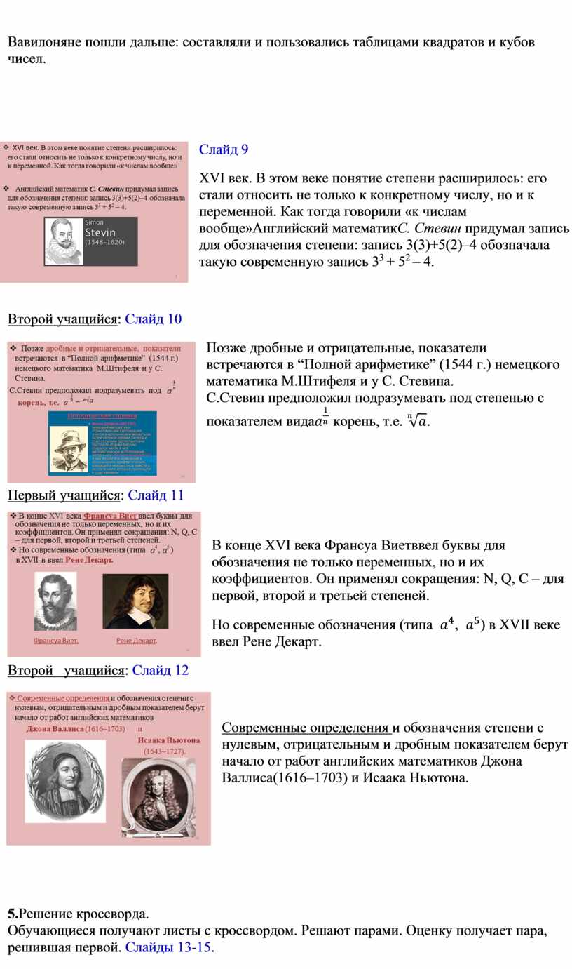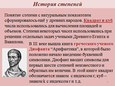 Понятие степени с натуральным показателем сформировалось ещё у древних народов. Квадрат и кубчисла использовались для вычисления площадей и объемов. Степени некоторых чисел использовались при решении отдельных задач учеными Древнего Египта и Вавилона.