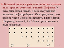 Большой вклад в развитие понятия степени внес древнегреческий ученый Пифагор. У него была целая школа, и всех его учеников называли пифагорейцами. Они придумали, что каждое число можно представить в виде фигур. Например, числа 4, 9 и 16 они представляли в виде квадратов.
