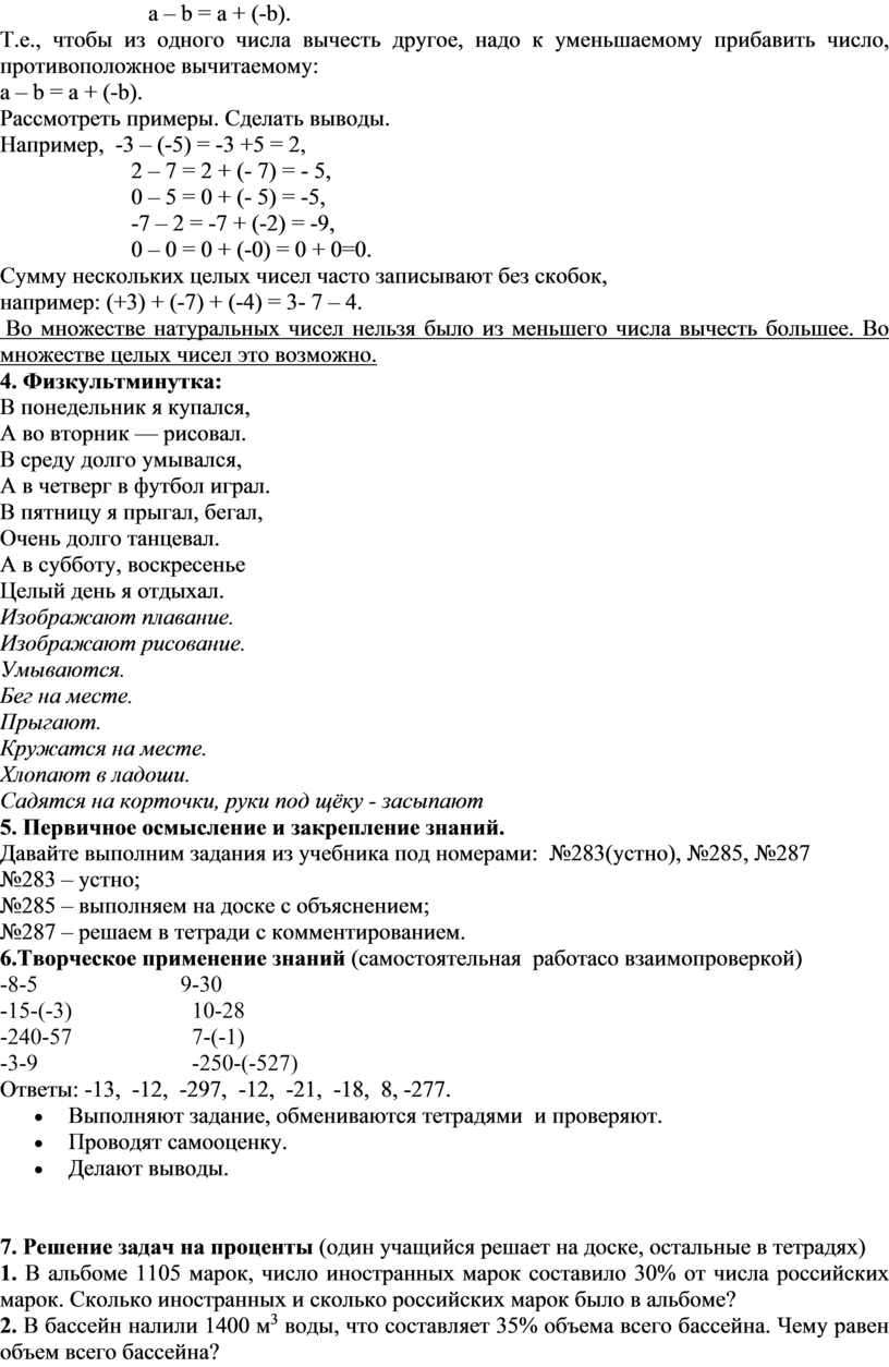 Цель урока: формировать умение выполнять вычитание целых чисел с помощью сложения числа, противоположного вычитаемому.