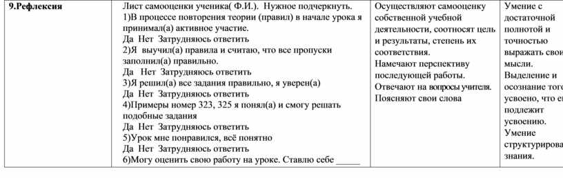 Лист самооценки ученика( Ф.И.). Нужное подчеркнуть. 1)В процессе повторения теории (правил) в начале урока я принимал(а) активное участие. Да Нет Затрудняюсь ответить 2)Я выучил(а) правила и считаю, что все пропуски заполнил(а) правильно. Да Нет Затрудняюсь ответить 3)Я решил(а) все задания правильно, я уверен(а) Да Нет Затрудняюсь ответить 4)Примеры номер 323, 325 я понял(а) и смогу решать подобные задания Да Нет Затрудняюсь ответить 5)Урок мне понравился, всё понятно Да Нет Затрудняюсь ответить 6)Могу оценить свою работу на уроке. Ставлю себе _____ |