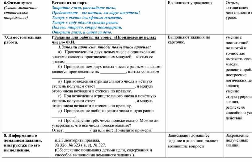 п.2.7,повторить правила, № 326, № 323 ( в, е), № 327. (Обеспечение понимания детьми цели, содержания и способов выполнения домашнего задания.) |