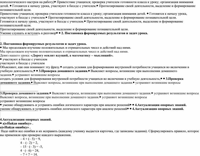 а)«Найди ошибку» . Надо найти все ошибки и их исправить (каждому ученику выдается карточка, где записаны задания). Сформулировать правило, которое вы применяли при проверке каждого выражения. – 4 + (– 5) = 9, 4 – (– 2) = 2, – 15 · (– 3) = -5, 4 · (– 6) = 24, – 7 + 7 = 14.