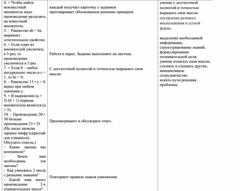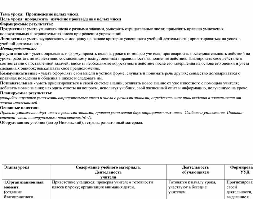 Предметные: уметь умножать числа с разными знаками, умножать отрицательные числа; применять правило умножения положительных и отрицательных чисел при решении упражнений.