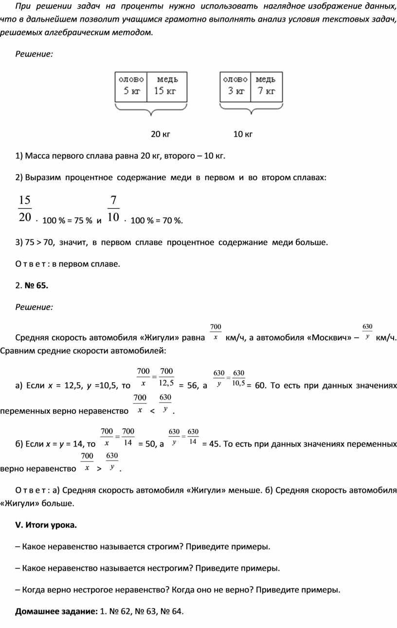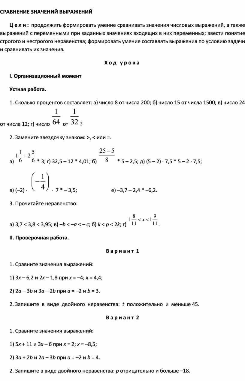 Цели: продолжить формировать умение сравнивать значения числовых выражений, а также выражений с переменными при заданных значениях входящих в них переменных; ввести понятие строгого и нестрогого неравенства; формировать умение составлять выражения по условию задачи и сравнивать их значения.