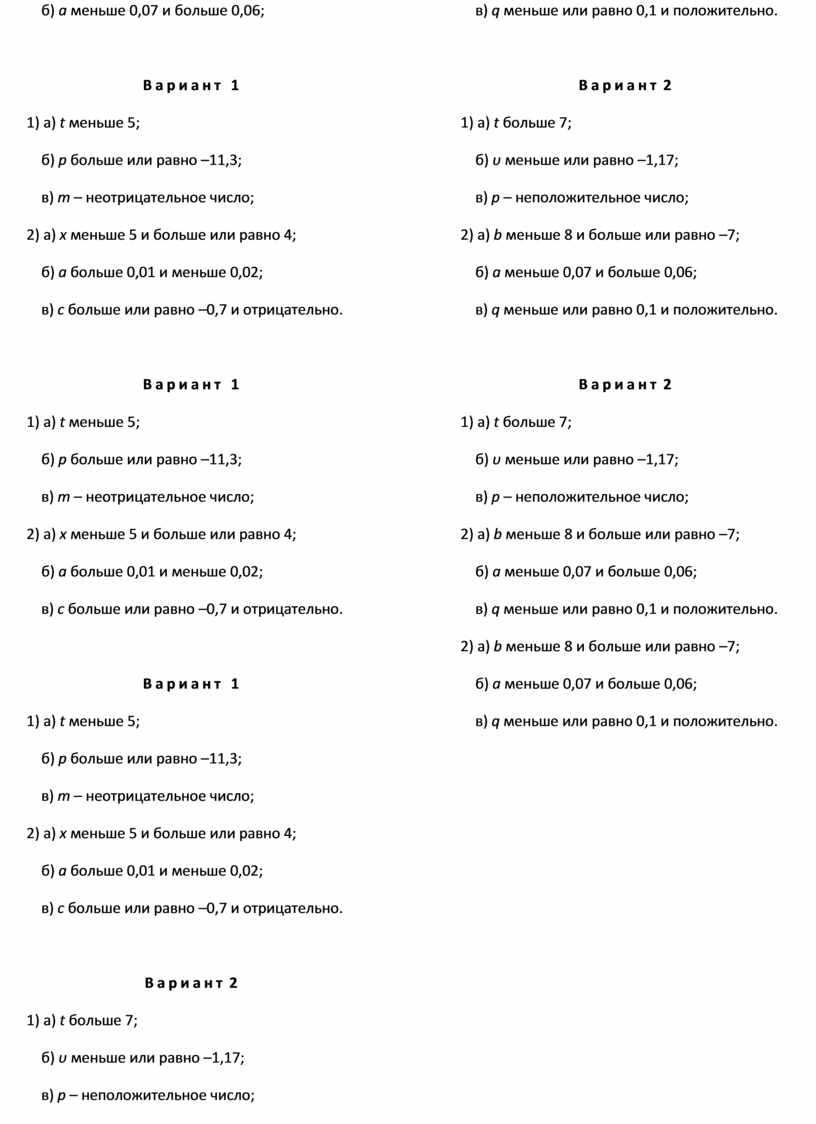 Запишите каждое предложение с помощью знаков неравенства. Подберите три значения переменной, при которых данное неравенство верно, и три, при которых неверно.