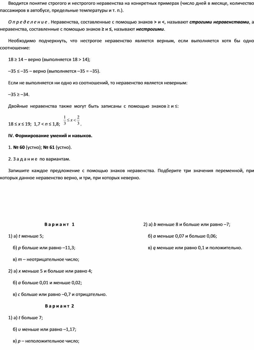 Вводится понятие строгого и нестрогого неравенства на конкретных примерах (число дней в месяце, количество пассажиров в автобусе, предельные температуры и т. п.).
