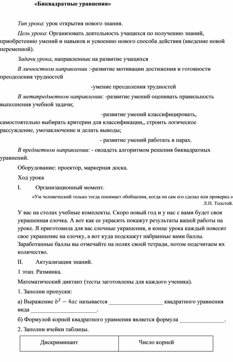 Цель урока: Организовать деятельность учащихся по получению знаний, приобретению умений и навыков и усвоению нового способа действия (введение новой переменной).
