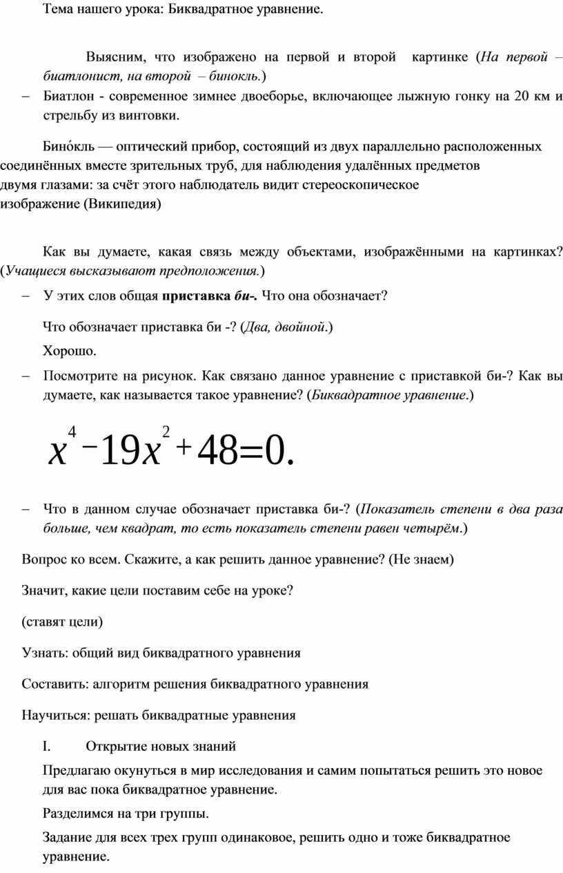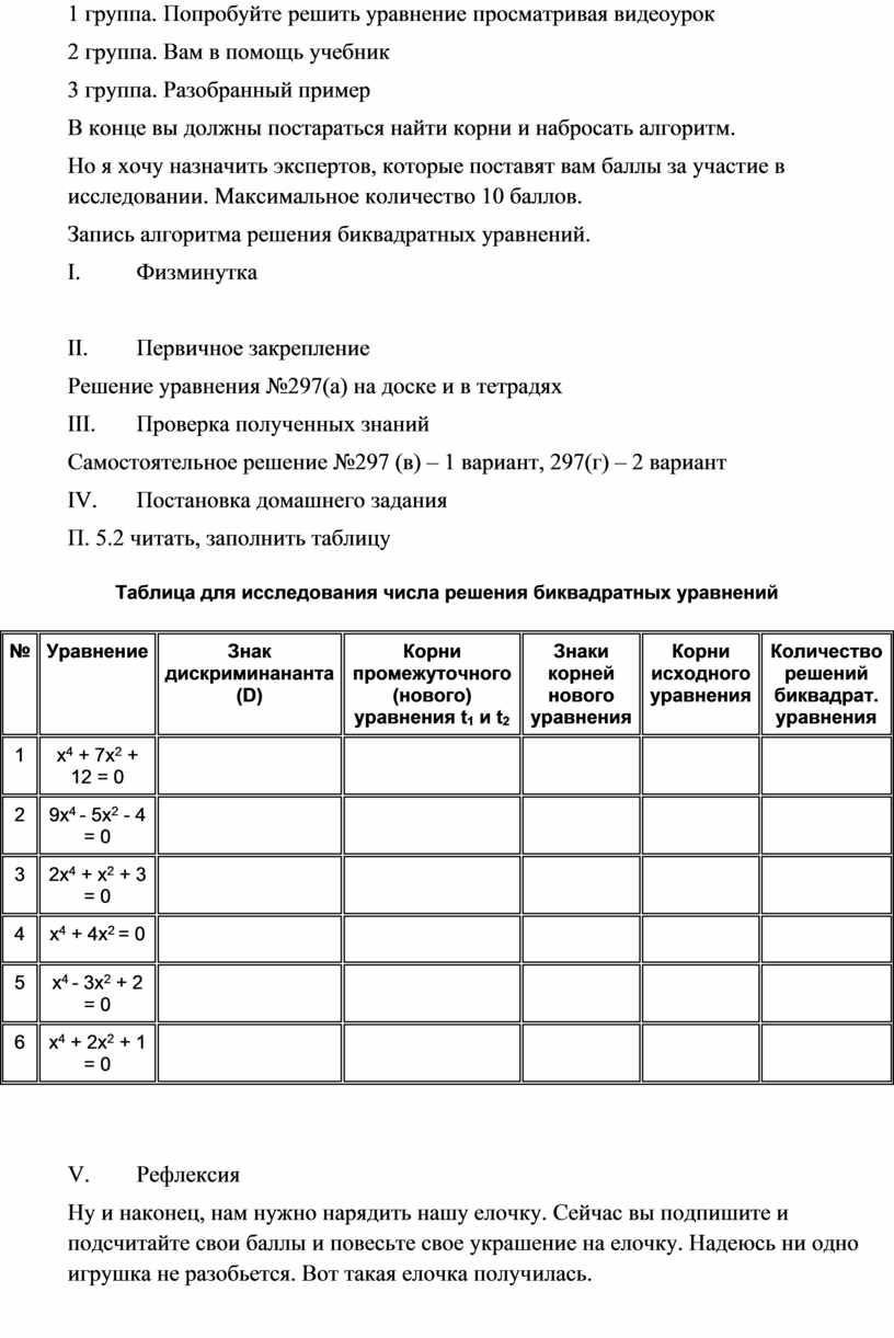 Задание для всех трех групп одинаковое, решить одно и тоже биквадратное уравнение.