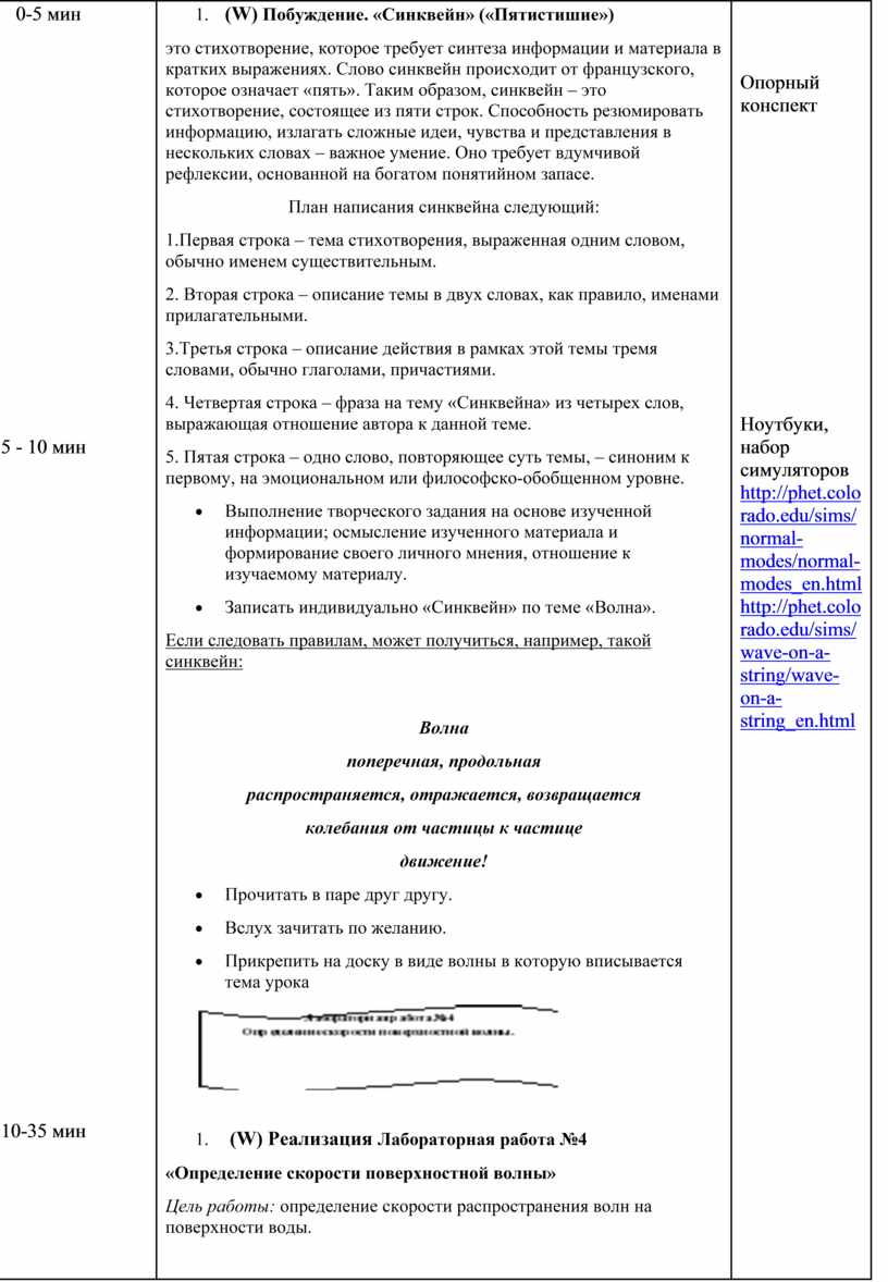 1. (W) Побуждение. «Синквейн» («Пятистишие») это стихотворение, которое требует синтеза информации и материала в кратких выражениях. Слово синквейн происходит от французского, которое означает «пять». Таким образом, синквейн – это стихотворение, состоящее из пяти строк. Способность резюмировать информацию, излагать сложные идеи, чувства и представления в нескольких словах – важное умение. Оно требует вдумчивой рефлексии, основанной на богатом понятийном запасе. План написания синквейна следующий: 1.Первая строка – тема стихотворения, выраженная одним словом, обычно именем существительным. 2. Вторая строка – описание темы в двух словах, как правило, именами прилагательными. 3.Третья строка – описание действия в рамках этой темы тремя словами, обычно глаголами, причастиями. 4. Четвертая строка – фраза на тему «Синквейна» из четырех слов, выражающая отношение автора к данной теме. 5. Пятая строка – одно слово, повторяющее суть темы, – синоним к первому, на эмоциональном или философско-обобщенном уровне. · Выполнение творческого задания на основе изученной информации; осмысление изученного материала и формирование своего личного мнения, отношение к изучаемому материалу. · Записать индивидуально «Синквейн» по теме «Волна». Если следовать правилам, может получиться, например, такой синквейн: