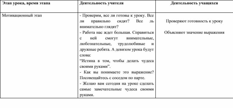 - Проверим, все ли готовы к уроку. Все ли правильно сидят? Все ль внимательно глядят? - Работа нас ждет большая. Справиться с ней смогут внимательные, любознательные, трудолюбивые и дружные ребята. А девизом урока будут слова: “Истина в том, чтобы делать чудеса своими руками”. - Как вы понимаете это выражение? Посовещайтесь с соседом по парте. - Желаю вам сегодня на уроке сделать самые замечательные чудеса своими руками. |