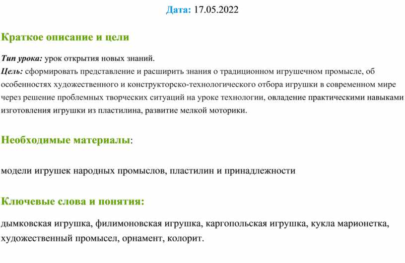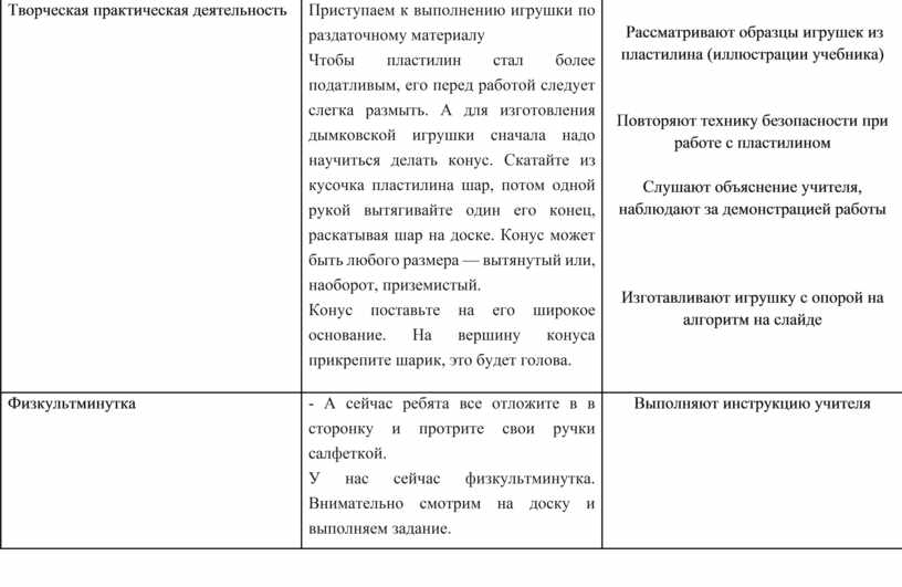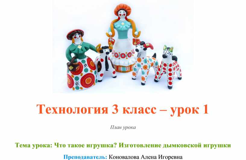 Цель: сформировать представление и расширить знания о традиционном игрушечном промысле, об особенностях художественного и конструкторско-технологического отбора игрушки в современном мире через решение проблемных творческих ситуаций на уроке технологии, овладение практическими навыками изготовления игрушки из пластилина, развитие мелкой моторики.
