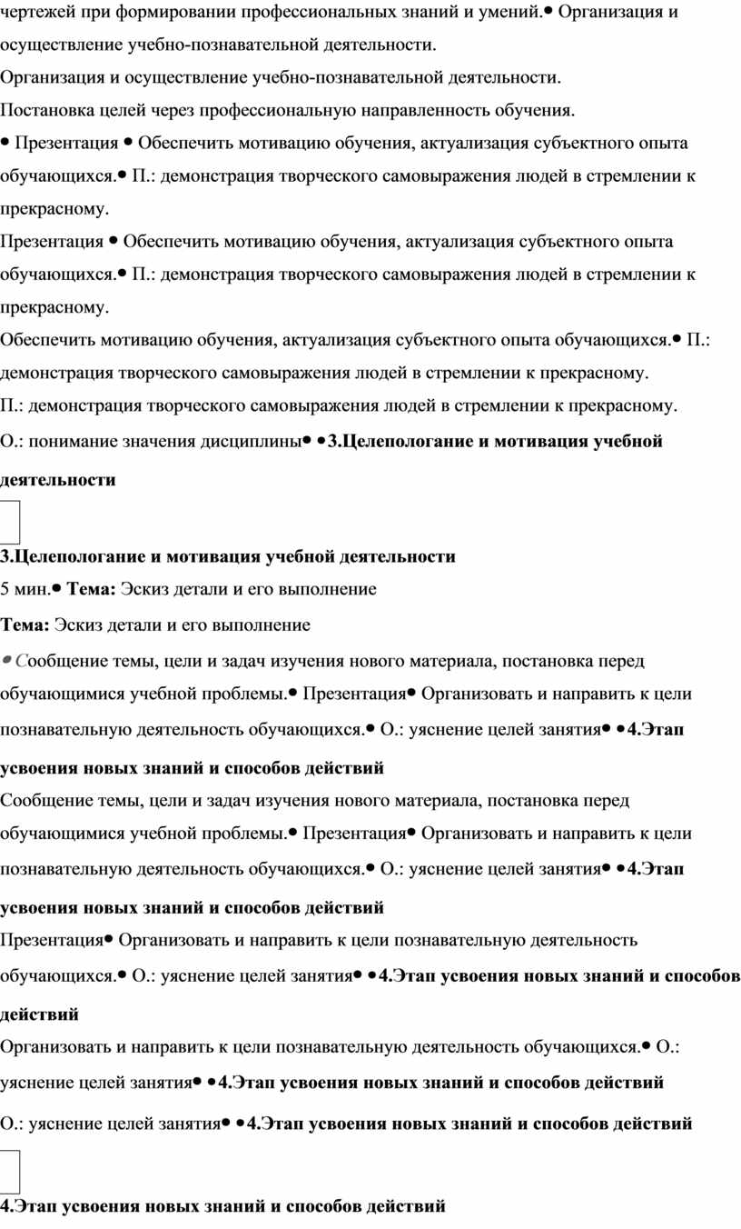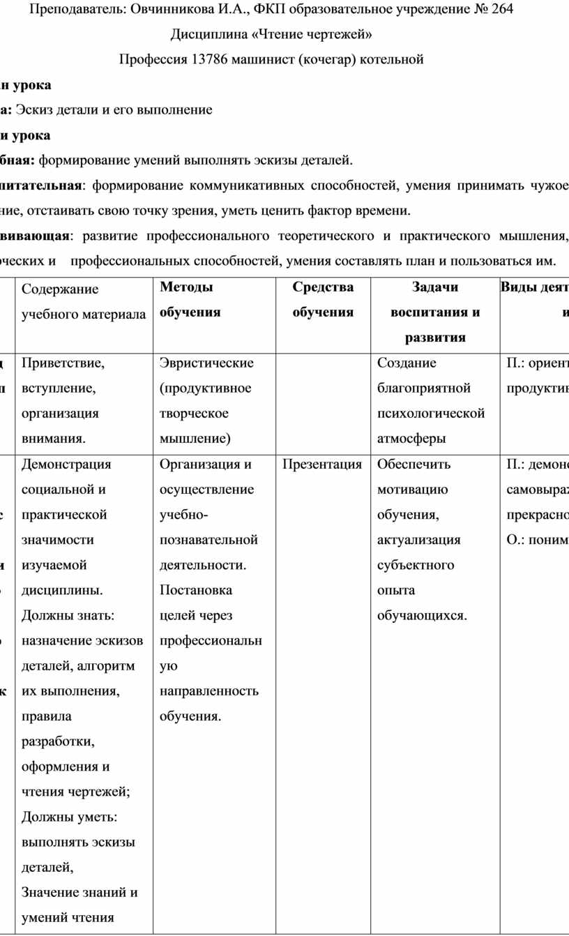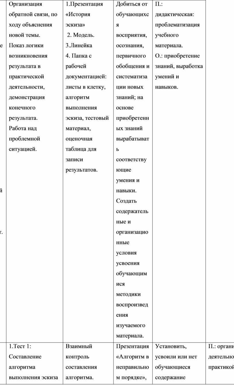 Основной метод обучения - объяснительно – иллюстративный с целью формирования у обучающихся графической грамотности. Методы и приемы обучения: демонстрация конечного результата, показ логики возникновения результата в практической деятельности, тестовый контроль, имитация практической деятельности, элементы игровой технологии - «Своя игра», составление алгоритма выполнения эскиза детали.