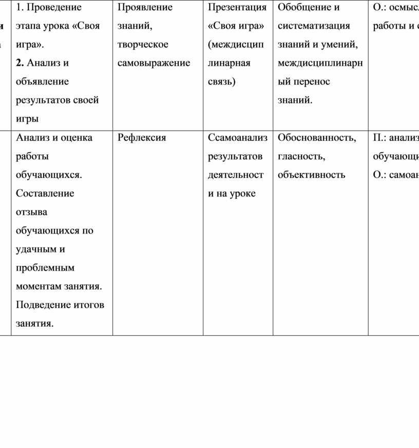 П.: анализ и оценка работы обучающихся О.: самоанализ результатов обучения |