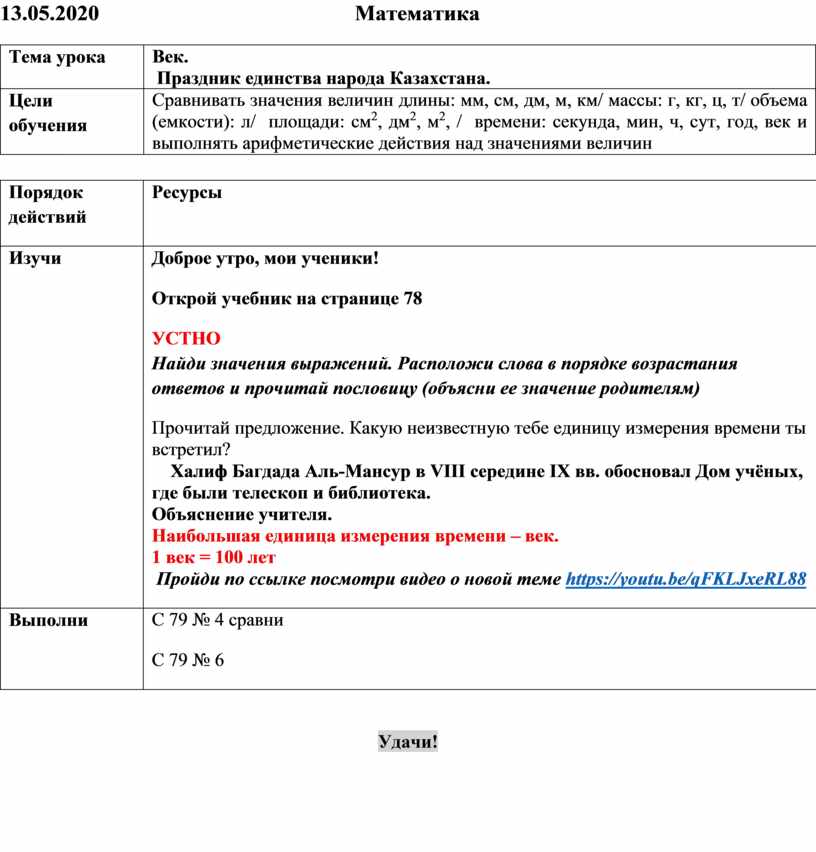 предложение. Какую неизвестную тебе единицу измерения времени ты встретил? Объяснение учителя. Наибольшая единица измерения времени – век. 1 век = 100 лет Пройди по ссылке посмотри видео о новой теме https://youtu.be/qFKLJxeRL88 |
