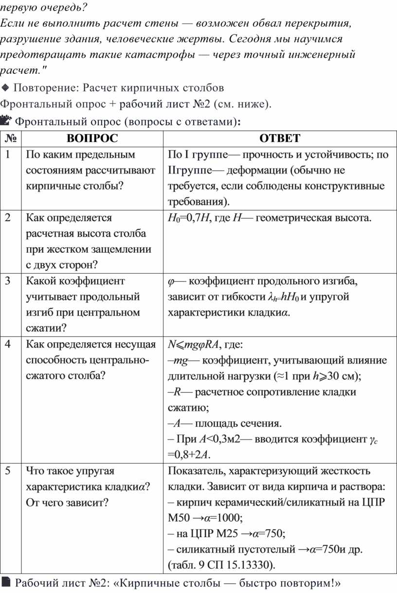 1. Повторить материал по расчету кирпичных столбов (фронтальный опрос, рабочие листы).
