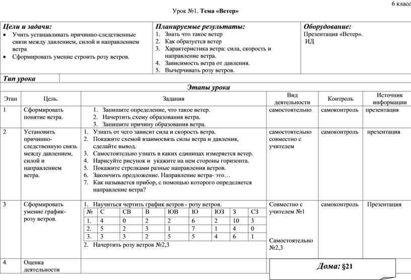 Планируемые результаты: 1. Знать что такое ветер 2. Как образуется ветер 3. Характеристика ветра: сила, скорость и направление ветра. 4. Зависимость ветра от давления. 5. Вычерчивать розу ветров. |
