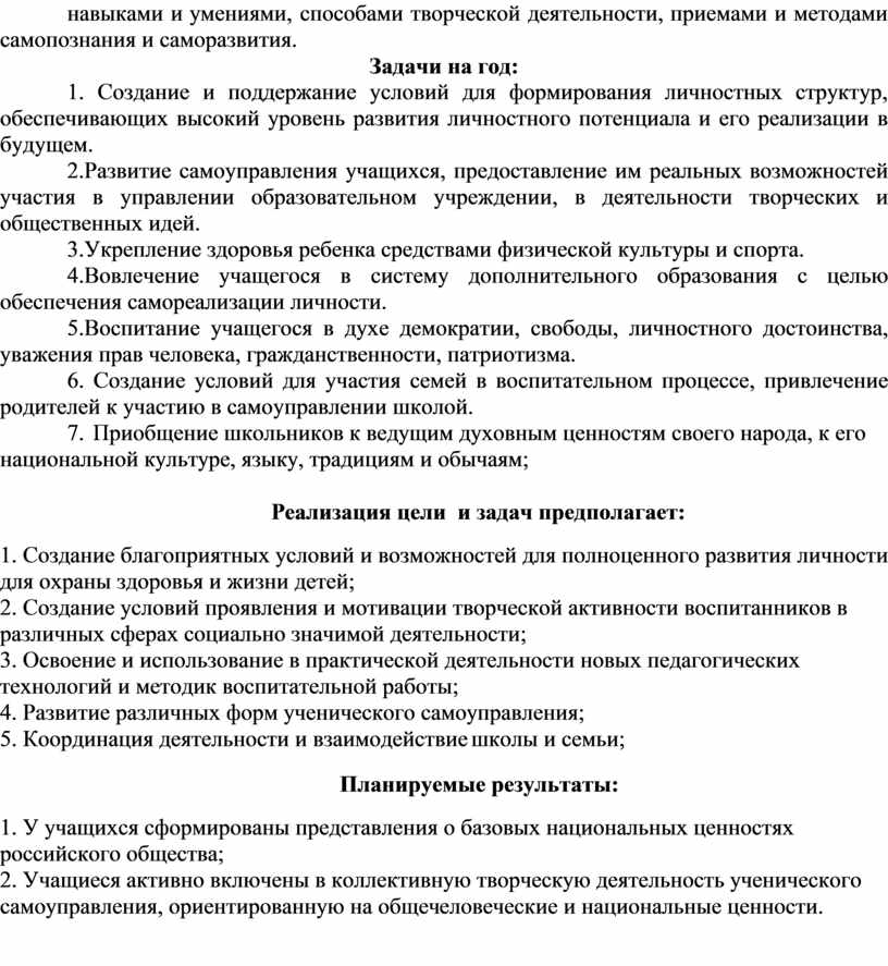 Реализация этих целей и задач предполагает: создание условий проявления и мотивации творческой активности воспитанников в различных сферах социально значимой деятельности; освоение и использование в практической деятельности новых педагогических технологий и методик воспитательной работы; развитие различных форм ученического самоуправления; координация деятельности и взаимодействие школы и семьи;