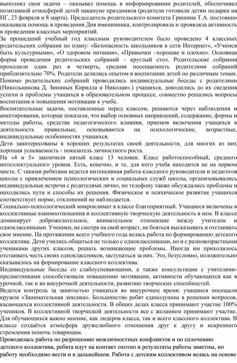 На «4 и 5» закончили пятый класс 13 человек. Класс работоспособный, среднего интеллектуального уровня. Есть, конечно, и те, для кого учеба находится не на первом месте. С такими ребятами ведется интенсивная работа классного руководителя и педагогов школы с привлечением психологических и социальных служб школы, организовывались индивидуальные встречи с родителями лично, по телефону также обсуждались проблемы и находились пути и способы их решения. Физическое и психическое развитие учащихся соответствует норме, отклонений не наблюдается.