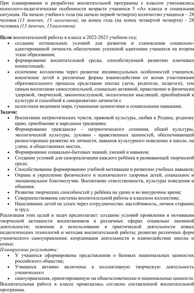 При планировании и разработке воспитательной программы с классом учитывались психолого-педагогические особенности возраста учащихся 5 «А» класса и социальная ситуация. На начало учебного года (на начало первой четверти) количество учащихся – 28 человек (13 девочек, 15 мальчиков), на конец года (на конец четвертой четверти) - 28 человека (13 девочек, 15мальчиков).