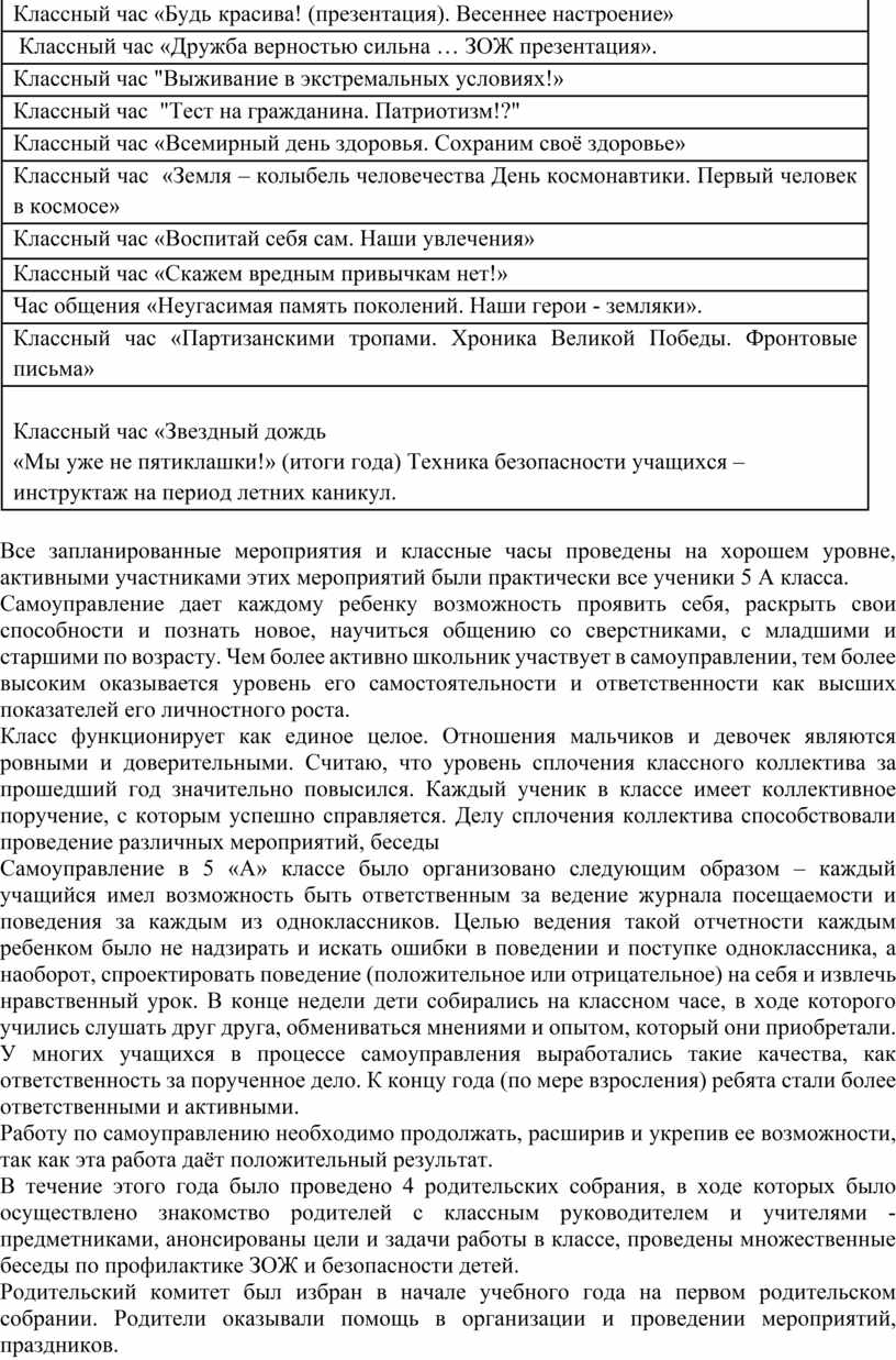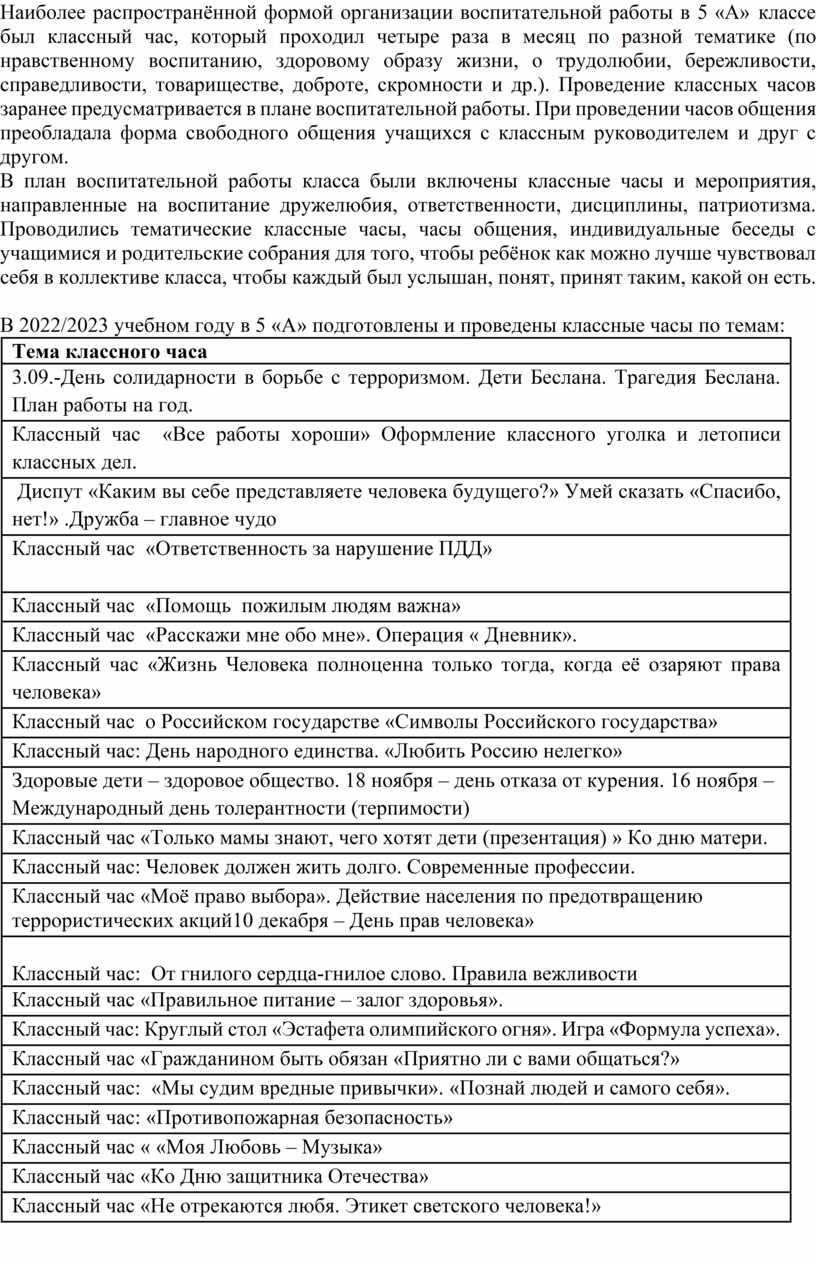 Наиболее распространённой формой организации воспитательной работы в 5 «А» классе был классный час, который проходил четыре раза в месяц по разной тематике (по нравственному воспитанию, здоровому образу жизни, о трудолюбии, бережливости, справедливости, товариществе, доброте, скромности и др.). Проведение классных часов заранее предусматривается в плане воспитательной работы. При проведении часов общения преобладала форма свободного общения учащихся с классным руководителем и друг с другом.