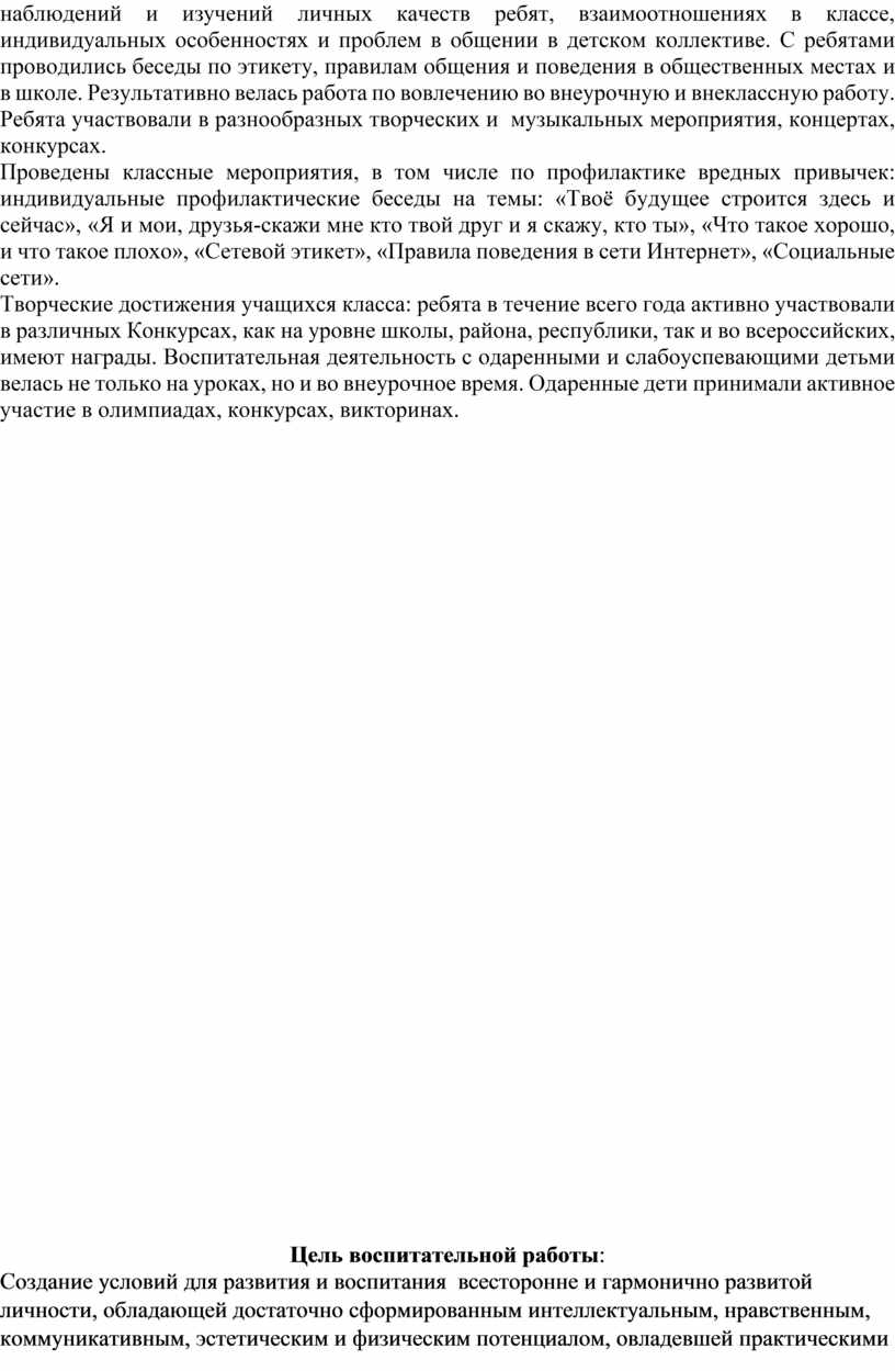Воспитательные задачи, поставленные перед классом, решаются через наблюдения и анкетирования, которые показали, что выбор основных направлений, содержание, формы и методы работы, средства педагогического влияния, приемов включения учащихся в деятельность правильные, основываются на психологические, возрастные, индивидуальные особенностях учащихся.