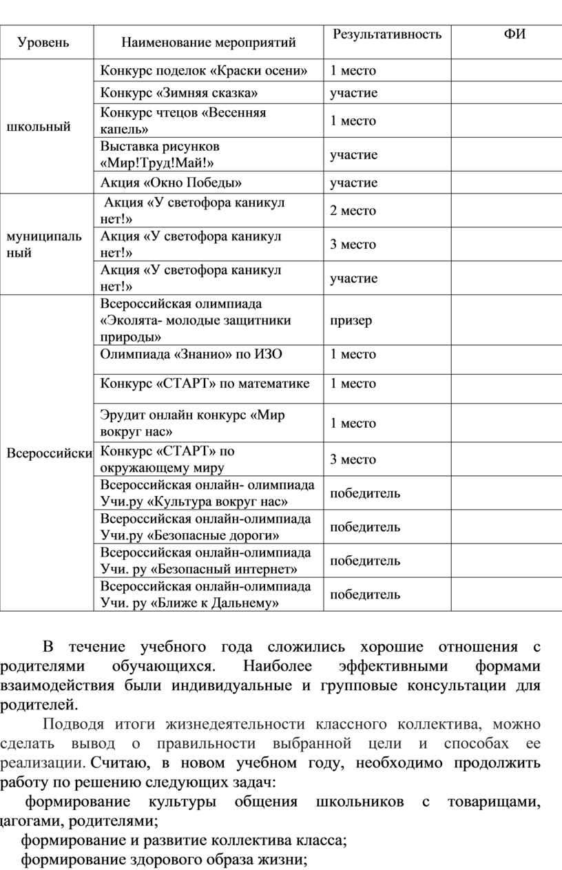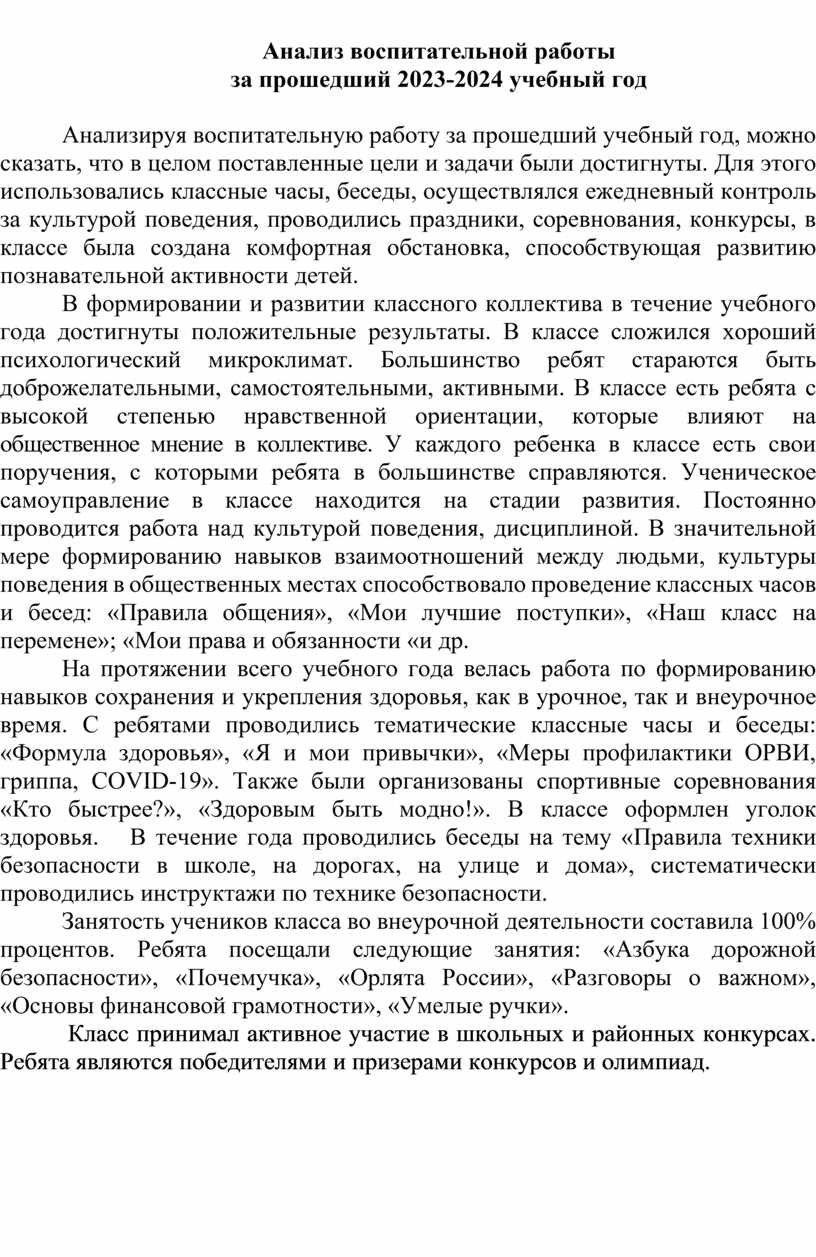 Анализируя воспитательную работу за прошедший учебный год, можно сказать, что в целом поставленные цели и задачи были достигнуты. Для этого использовались классные часы, беседы, осуществлялся ежедневный контроль за культурой поведения, проводились праздники, соревнования, конкурсы, в классе была создана комфортная обстановка, способствующая развитию познавательной активности детей.