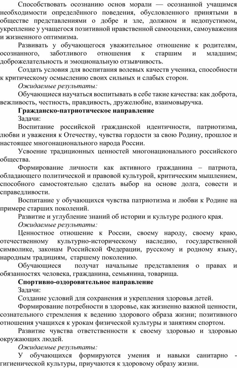 Способствовать осознанию основ морали — осознанной учащимся необходимости определённого поведения, обусловленного принятыми в обществе представлениями о добре и зле, должном и недопустимом, укрепление у учащегося позитивной нравственной самооценки, самоуважения и жизненного оптимизма.